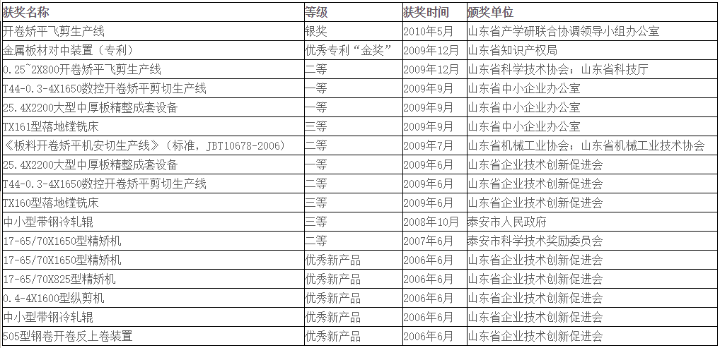 “T44-5~25.4×2200開卷矯平移動剪切生產(chǎn)線”入選“2010年度中國國內(nèi)首臺套技術(shù)裝備示范項目”,“大型數(shù)控中厚板精整成套設(shè)備產(chǎn)業(yè)化項目”被列入2011年山東省自主創(chuàng)新成果轉(zhuǎn)化重大專項計劃;