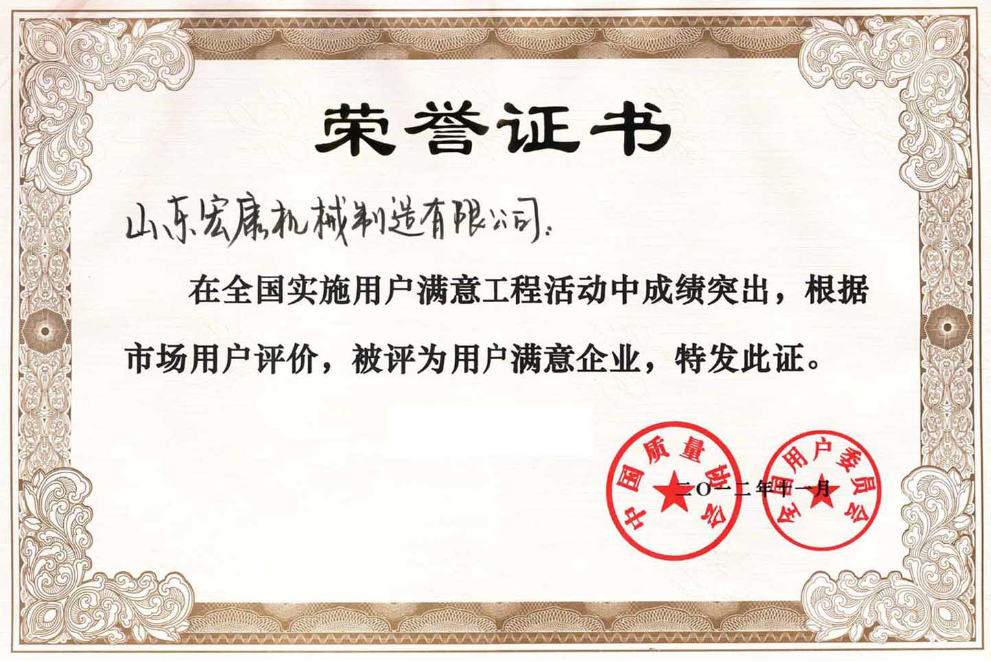 中國(guó)質(zhì)量協(xié)會(huì)榮譽(yù)證書(shū)